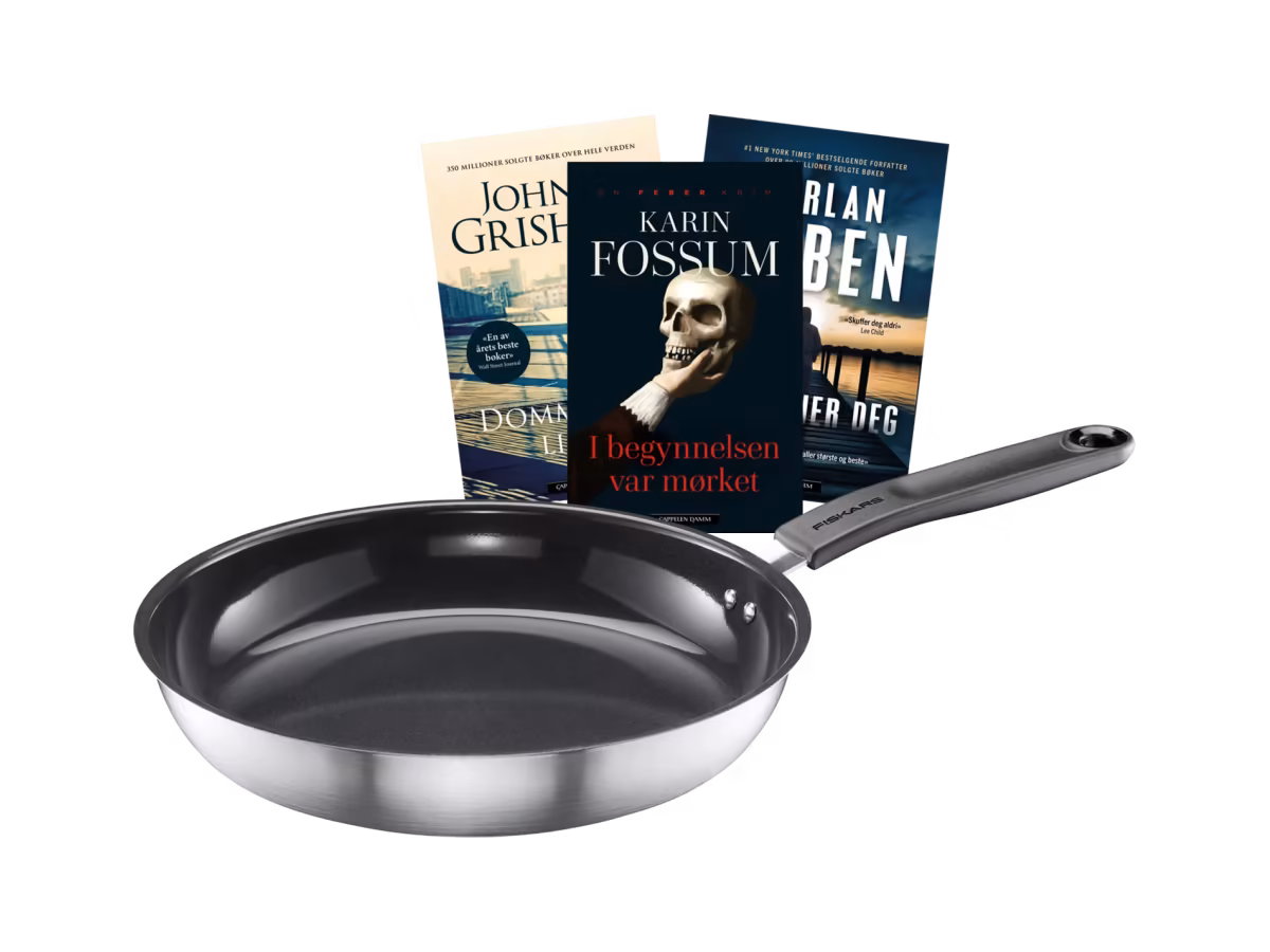 Få en Fiskars Functional Form stekepanne og 3 valgfrie krimbøker i velkomstgave fra Krimklubben – verdi opptil 1876 kr.