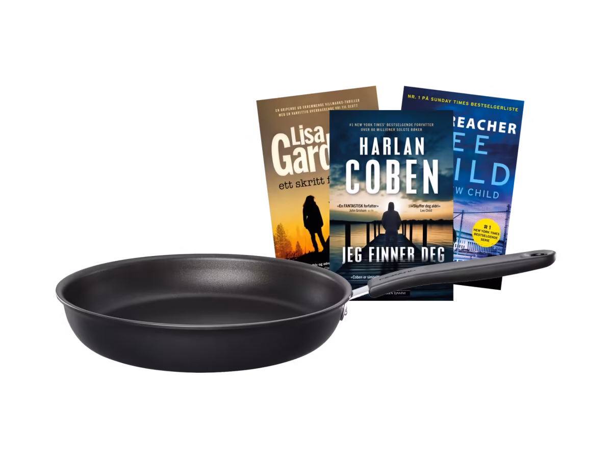 Få en Fiskars Functional Form stekepanne og 3 valgfrie krimbøker i velkomstgave fra Krimklubben – verdi opptil 1876 kr.