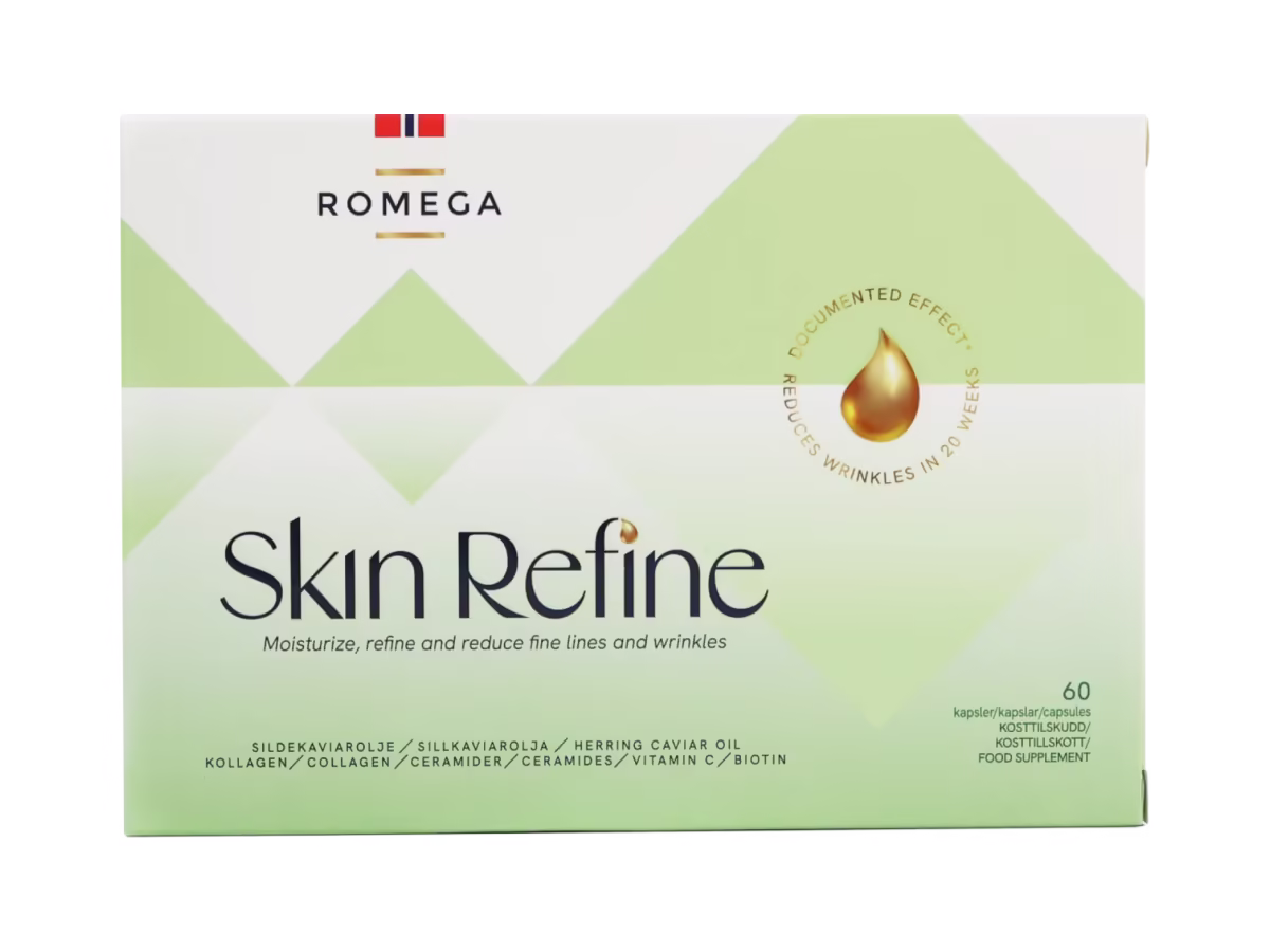 Få 70 % rabatt på Romega® SKIN REFINE – prøv det i 60 dager! Et kosttilskudd med marint kollagen, hveteceramider, Romega® sildekaviarolje, vitamin C og biotin.